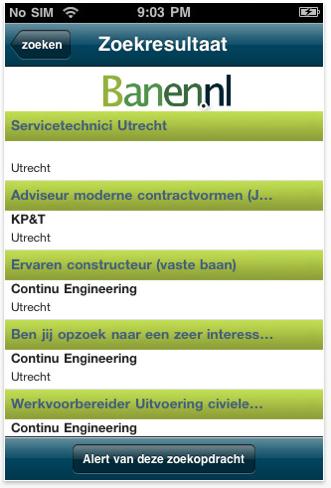 Banen.nl heeft een iPhone app ontwikkeld die onder de naam “banen” beschikbaar is in de iPhone app store. Zelf heb ik geen iPhone dus ik kan niet testen hoe het precies werkt. Wel hieronder enkele screenshots van de app.