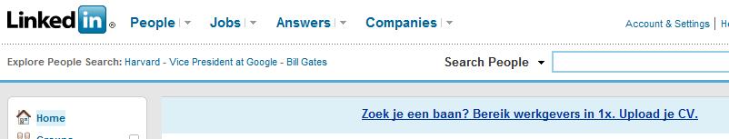 Log ik zojuist even in bij Linkedin, zie ik een mooie tekstlink van Volkskrantbanen.nl (screenshot) op mijn persoonlijke homepage staan. Althans, dat het een link van Volkskrantbanen.nl is zag ik pas toen ik op de error-page (mirror) erachter terechtkwam. Of advertentiebedrijf webads of de marketeer bij Volkskrantbanen.nl zit al een poosje te slapen. Slechte zaak. Ik ben benieuwd wanneer de link het weer zal doen. Op deze manier zal het niet veel cv’s opleveren, terwijl de CPC-kosten wel gemaakt worden. Daarbij blijft het de vraag of het verstandig is om de naam (in dit geval dus VKbanen) niet te noemen in de tekstlink.