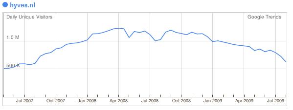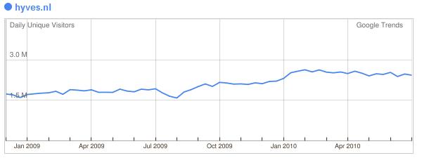 Google Trends zou een beeld geven van traffic op websites. Maar niet heus. Check hieronder twee screenshots van Google Trends met data van hyves.nl. De bovenste is van augustus 2009. De onderste van augustus 2010.
